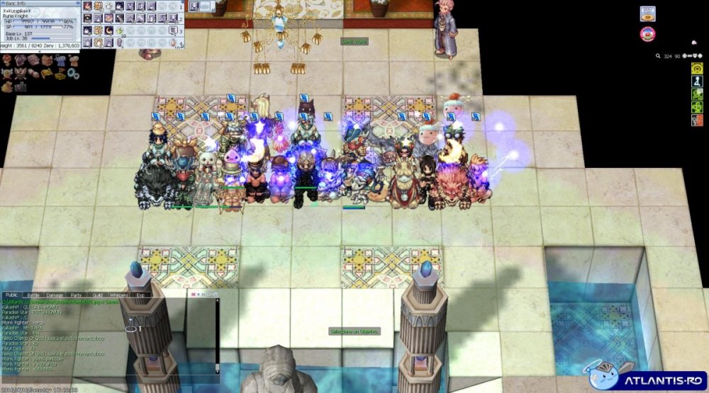 Introducción Para empezar, existen muchas builds de RK de las cuales solo mencionare dos porque considero son las más versátiles. El Rune Knight (abreviado RK) es un pseudo-tanque ofensivo capaz de desempeñarse bien en casi todos los aspectos del juego. Alcanza el HP más alto de todos los personajes, y posee varias formas de provocar un daño decente, tanto individualmente como en AOE (Área of Effect). Existen principalmente cuatro tipos de Rune Knight: Dragon Breath, Sword Skill, Spear Skill y ASPD/Frenzy. Todos ellos provocan Daño Físico al atacar (la única excepción son los RK de Autocast Mágico). Sin embargo, debido a la cantidad de STATS que se alcanzan a repartir, es posible combinar una Build de Rune Knight con cualquiera de las otras Build, logrando infinitas combinaciones posibles. Esto le permite a cada jugador crear su propia Build, totalmente versátil y personalizada. Adicionalmente, gracias a la skill Rune Mastery, todos los Rune Knight son capaces de crear y utilizar Runas, unos objetos consumibles que agregan diferentes buffs, técnicas ofensivas y técnicas defensivas. Un verdadero Rune Knight debe saber utilizar las Runas, ya que la ventaja que otorgan en combate es abrumadora (sea la build que sea). Build Build de Dragon Breath (DB) 1. Vision General Ventajas: · Son muy Fuertes en Mid Game, ósea que cuando llegas a nivel 135+ tienes buen daño (pegas 24K) y buen aguante (75K de HP). · Ataque en área 9x9 tipo fuego y agua, eres el terror del tipo Undead, Fire y Earth. · Con la ayuda de la canción MS (Magic Strings), es la build que provoca el mayor DPS (Damage Per Second) de todo el juego. · Por su alto HP, esta build es ideal para usar Death Bound, una de las skill más brutales en PVP que refleja el daño (en lvl 10 reflejas 1500% de daño a tu adversario). · Eres un asesino de Scarabas; mobeas muchas y matas de una. · Aportas a la party con una considerable cantidad de daño cuando van a instancias, HTF, Endless, Faceworm, Hocus y caseria de MvP fuertes. Desventajas · Son muy difíciles de subir de nivel al inicio, no pegas mucho (como 10k de daño). · Sin MS debes enfrentarte a los dos segundos de cooldown (CD), en mi opinión un poco desagradable. · Pegas con elemento fuego y agua solamente. · Tu única Skill ofensiva es Dragon Breath; asi que estas limitado a cierta cantidad de mobs. · La Mob elemento Holy y Shadow lvl 4 es tu terror de cada día. 2. Stats Se le coloca una modera cantidad de Str para cargar más potas y Agi para poder tirar spam del DB cuando tenemos MS. Lo demás lo dejo a la libre interpretación. 3. Skills Primera Clase. Segunda Clase. Tercera Clase. La fórmula del Dragon Breath: Damage = [(CurrHP ÷ 50) + (MaxSP ÷ 4)] × (SkillLv × BaseLv ÷ 150) × (95 + DragonTraining_Lv × 5)% × (100 + Ranged Damage Modifiers)% x (Elemental Modifiers)% Con esta fórmula puedes calcular el daño de la Skill y determinar cual es la mejor combinación para producir el máximo daño posible. 4. Equipo 4.1. Opción A (Enfocada en daño) La habilidad de Dragon Breath escala por daño de rango, HP y SP solamente; si quieres maximizar el daño céntrate en estos aspectos. Upper: · Ship Captain Hat +8 en adelante con Carat Card, Bungisngis Card. · Baphomet Horns para resistencia en WoE. Mid: Modified Fin Helm. Lower: Captain´s Pipe. Armor: · Glorious Suit con enchants de Vit, Int. · WoE Plate +9 con Marc card, Peco Peco Card para WoE. · Excellion Suit con triple Auxiliary Reactor MaxHP (A-MaxHP) +6 en Adelante. Weapon: · Tegron+9 con Archer Skeleton Card y enchants de EA. · Combat Knife con enchants de EA. · Mace con cuatro Archer Skeleton Card. Shield: · Valkyrja's Shield con Thara Frog Card para WoE. · Immune shield. Garment: Gigant Snake Skin con Menblatt Card y enchants de Vit y Int. Shoes: Temporal DEX +9 con Antique Firelock Card. Accessories: · Foot Ring · Ur´s Seal con Alligator Card. 4.2. Opción B (Enfocada en el Spam) Gracias a la nueva actualización del episodio 15.2 tenemos acceso a nuevas opciones que nos permite darle un valor agregado a esta habilidad (DB), entonces esta opción nos centramos en reducir el ACD (after cast delay) para aumentar el dps sin necesidad de un MS. Upper: · Ship Captain Hat +8 en adelante con Carat Card, Bungisngis Card o Kathryne Keyron Card. · Valentine's Hat. Mid: Modified Fin Helm. Lower: · Captain´s Pipe. · Angry Mouth. Armor: Excellion Suit con triple Auxiliary Reactor MaxHP (A-MaxHP) +6 en Adelante. Weapon: Tegron+9 con Archer Skeleton Card y enchants de EA. Garment: Excellion Wing con A-MaxHP triple +4 en Adelante. Shoes: Temporal DEX+9 con Antique Firelock Card. Accessories: Sarah's Right Earring y Sarah's Left Earring con enchants de ACD lvl 5 En total tenemos una reducción de ACD del 60%. Suficiente para tirar un Dragon Breath por segundo. El daño se reduce un poco a comparación de la Opción A; pero a cambio se obtiene más dps. 5. Tácticas de combate WoE El RK siempre debe estar acompañado de un MS en todo momento para sacar el máximo provecho a esta build, cabe destacar que si el MS tira The Apple of Idun (HP), Frigg's Song y Service for You (SP) podemos alcanzar una considerable cantidad de daño. Podemos sacar el máximo provecho a esta build con Tao Gunka card, mas no la considere porque es prácticamente muy difícil de conseguir. Por otro lado, podemos aumentar nuestro daño con gospell en lvl 10(El buff que duplica el HP y SP) dándonos como resultado 450k de HP más o menos y como si fuera poco puedes utilizar Tao Gunka Scroll con una Tao Gunka Card para llegar a la monstruosa cantidad de 800k de HP con comidas y potas de HP Large, recomiendo potear con Berrys :3 Para WoE debes estar siempre metido en el centro de la party(alado del MS), tienes un buen rango ósea que pegas muy lejos, hasta el borde de la pantalla, potea mucho, no dejes que tu HP baje y mantenlo siempre al 100%. Si aparece un Guillotine en el centro de la party usa Death Bound, esta a