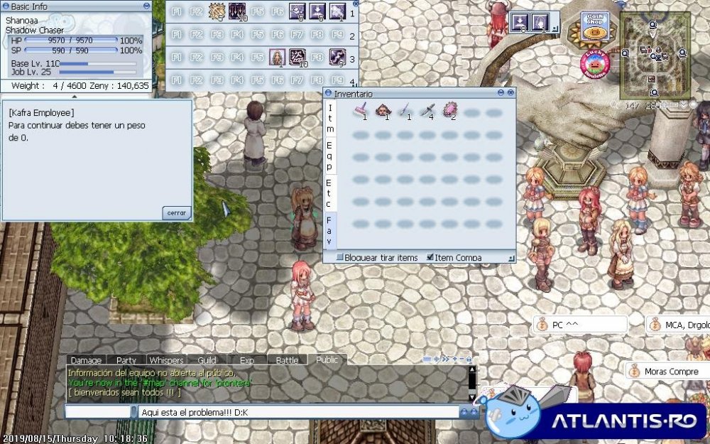 Saludos, mi problema empieza con mi cahser que posee 5 items de peso 0 que son inremovibles que aprecen marcados en mi contador de peso, la npc rechaza el conteo de estatus para el precio por esto. por favor solucionenlo rapido y revisen que no sea un bug general  que tengo varios pj con items inremovinles de peso los cuales planeo resetear. Posdata: porque quitaron el primer reset gratis de estatus y skills que les pasa!! D:K