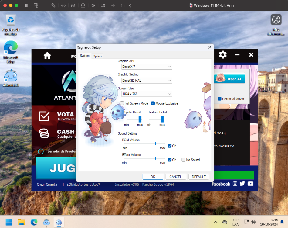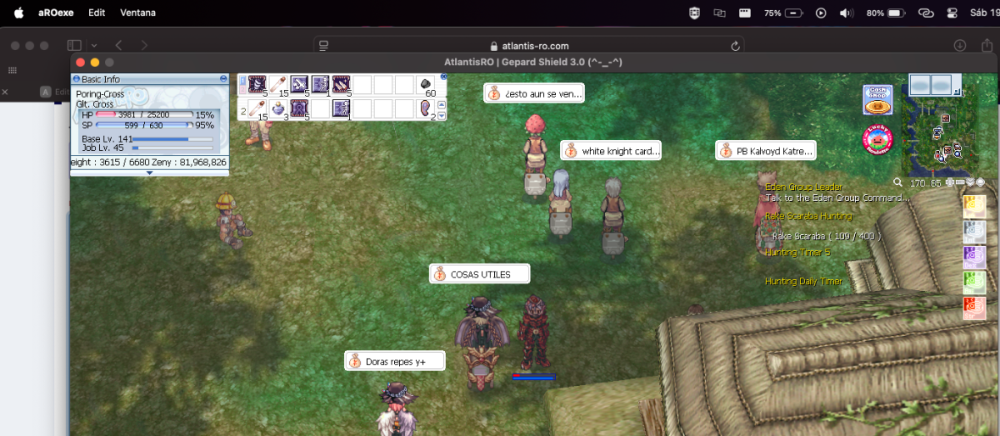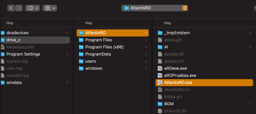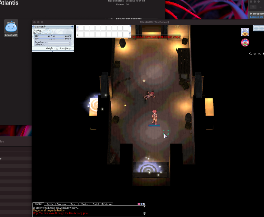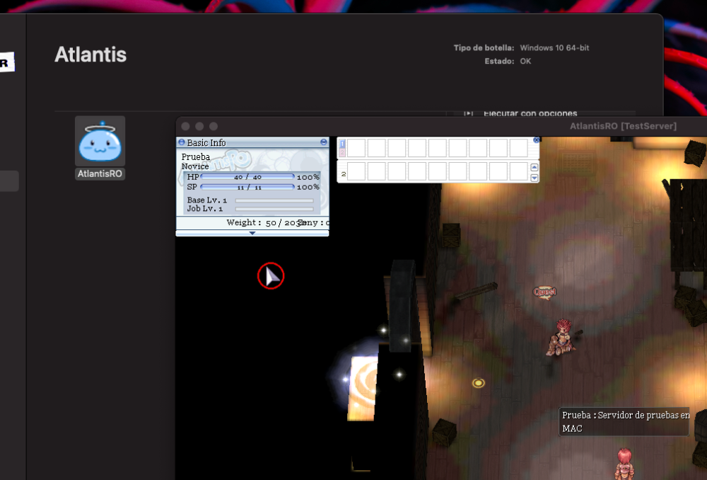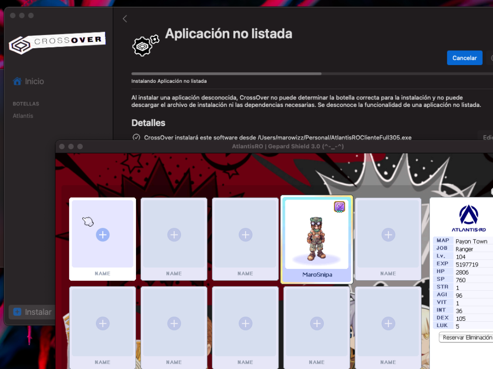 Hola a todos, les comento que he estado tratando de ejecutar el juego desde MAC ya que no corre bien desde la maquina virtual pero tengo el siguiente error Gepard::T Code: 3::110::12 Dejo el proceso para quienes quieran hacerlo y así tratar de buscar alguna solución. Estoy utilizando la versión de prueba de crossover (https://www.codeweavers.com/crossover) Descargo el cliente desde la pagina de Atlantis (https://www.atlantis-ro.net/descargas/) Luego desde la aplicación ingreso crossover ingreso a "Ingresar una aplicación no listada" Buscar el instalado de Atlantis (AtlantisROClienteFull305.exe) y le damos a instalar Nos solicitará elegir el nombre de la nueva botella y el tipo de botella, en este caso elegí Windows 11. Luego se abrirá el instalador típico de Windows, donde simplemente le damos a siguiente hasta finalizar. Luego le damos a Terminar donde se nos ejecutará la aplicación Nos indicará que existe una nueva actualización y le damos a ok. Comenzará la actualización del cliente Al finalizar se nos abrirá el Setup. En este caso probé todas las combinaciones posibles y todas dieron el mismo error. Al presionar "Jugar" nos abre el la ventana del juego donde podemos lograr sin problemas. El problema viene cuando selecciono el personaje y carga el juego. Se ve el PJ en la ciudad e instantáneamente aparece el error. Porfa, si alguien tiene algún indicio de como poder continuar se los agradecería. Debo mencionar que al servidor de pruebas puedo ingresar sin problemas Saludos!