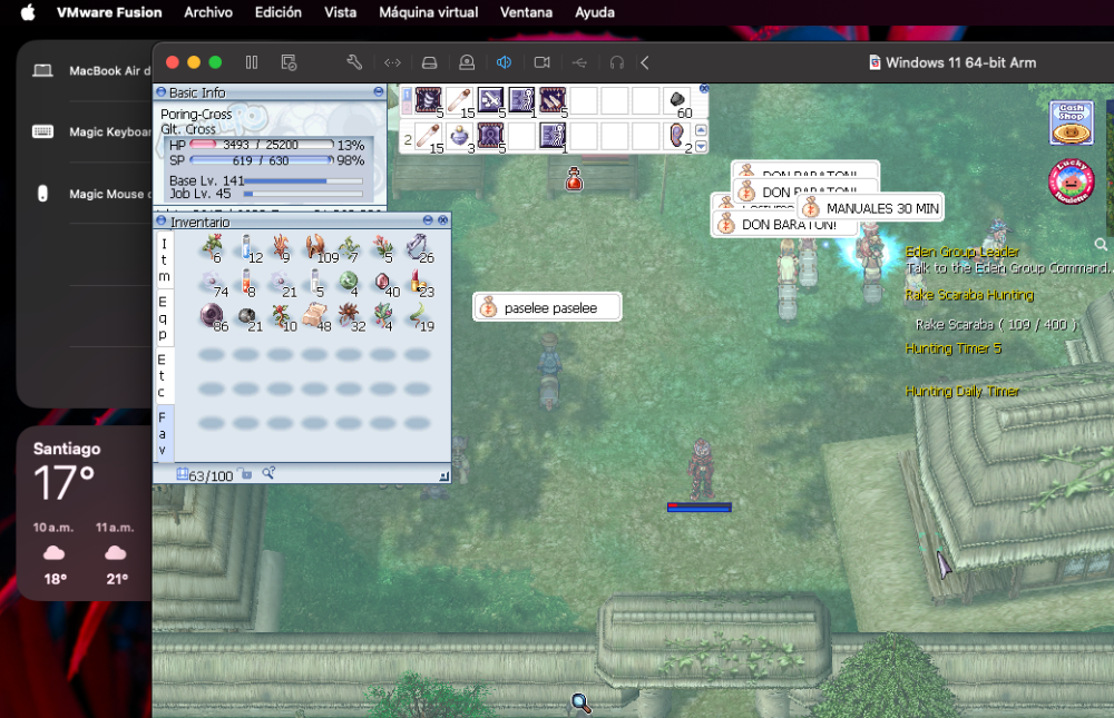 Hola a todos, después de varias pruebas y análisis les comparto el proceso para instalar de dos formas distintas Atlantis en MAC, favor considerar que yo estoy utilizando un MacBook Air de 8 RAM con procesador M2. 1ra Opción - App Whisky Creo que esta es la mejor opción debido a que se puede ejecutar sin necesidad de una maquina virtual. Comenzamos descargando e instalando la APP Whisky (https://getwhisky.app/es/) Creámoslas una nueva botella con versión de Windows 10 Luego le damos al botón inferior izquierdo "Ejecutar" Donde buscaremos el archivo .exe de AtlantisRO (no entraré en detalles pero se descarga desde https://www.atlantis-ro.net/descargas/) Nos abrirá el instalador de Atlantis donde solo le damos siguiente hasta finalizar. Luego esperamos a que el cliente se actualice y configuramos el setup a nuestra elección. Le damos a jugar y listo. Para agregar un acceso directo en Whisky al ejecutable de Atlantis debemos ingresar a Anclár Programa Luego en Explorar donde buscaremos el archivo .exe Luego a anclar y así nos quedará el acceso directo para jugar dentro de Whisky 2da Opción - Maquina virtual VMWare Lo bueno: Quedas con una maquina virtual completamente utilizable para MAC. Lo malo: Con 8 de RAM en el MAC es un poco molesto jugar, hay que configurar bien la RAM y los CORE de la maquina virtual. Lo primero es crearse la cuenta en https://support.broadcom.com lo cual es gratis. Posteriormente debes ingresar al siguiente link para descargar VMware Fusion de uso personal https://support.broadcom.com/group/ecx/productfiles?subFamily=VMware+Fusion&displayGroup=VMware+Fusion+13+Pro+for+Personal+Use&release=13.5.2&os&servicePk=520445&language=EN Buscar en nuestra AppStore la aplicación CrystalFetch ISO Downloader Esto es para descargar un sistema operativo con la arquitectura ARM Al abrir la aplicación dejamos la siguiente configuración (el idioma que ustedes quieran, en este caso español) y luego a Download. Esto descargará el sistema operativo, luego de la descarga te solicitará donde guardar el ISO. Ahora con todo descargado, comenzamos instalando VMware abriendo el archivo descargado en el punto N° 2. Se solicitarán los típicos permisos para la instalación. Arrastramos la imagen del disco descargado. Seleccionamos el firmware de arranque en UEFI Asignamos una contraseña para la encriptación, esto nunca lo he utilizado, pero es obligatorio. Al finalizar comenzará la instalación del sistema operativo. Considerar los siguientes puntos de la instalación Se debe seleccionar Instalar Windows 11 y seleccionar "acepto que se elimine todo, incluidos los archivo,...." En la clave del producto se debe seleccionar "No tengo clave del producto" Al seleccionar la imagen a instalar yo seleccione Windows 11 Pro Luego es siguiente, siguiente, siguiente e instalar. IMPORTANTE: Tuve muchos problemas el instalar W11 ya que te obliga a conectartelos a internet para finalizar la configuración La forma de solucionarlo fue la siguiente: En esta pantalla Debemos presionar la tecla tecla shift + fn + F10 y nos abrirá el cmd de windows donde debemos ingresar el siguiente comando oobe\bypassnro el cual nos hará un bypass para poder omitir este paso. Al presionar enter, la maquina virtual se reiniciará. Al cargar nuevamente, nos pedirá la configuración nuevamente y al llegar a la pantalla anterior nos habilitará el botón "No tengo Internet" Se continua con la configuración (nombre del equipo, contraseña, permisos y configuración de windows, etc) al finalizar ya tenemos windows 11 en una maquina virtual en MAC Instalar VMware Tools, el cual nos simulará un driver de video para poder jugar. Desde la barra de accionarial de VMware ingresar a Máquina Virtual -> Install VMware tools Esto simulará que la maquina virtual tiene un CD por lo que debemos entrar en Este Equipo -> Click derecho -> Instalar o ejecutar... Instalación típica, siguiente, siguiente, siguiente y se reiniciará la maquina virtual. Instalaciones de Atlantis, no voy detallar ya que es obvio. Solo recalcar que cuando se descarga el archivo Windows indica que puede ser peligroso y hay que darle a Conservar En la configuración tiene que ser DirectX7 Y listo, a jugar Saludos!