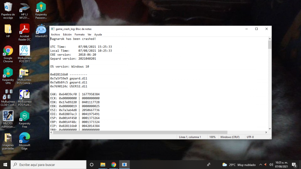 Ro se Crashea al intentar loguearHarp Note responde a Harp Note de tema en Soporte técnico/Problemas :c ps igual yo no había tenido problema Como dije, estaba de lo mas tranquila jugando, cuando de repente pum, se crasheo y ya no me dejo loguear ; w ; Desinstale el juego y volvi a descargar de nuevo todo el cliente, e instalarlo de nuevo. Tuve que repetir el proceso 4 veces, y al parece ser ya al 4to intento se compuso la cosa, porque ya me dejo loguear normal y no me crasheo ewe Solo se que es un desmadre ocasionado por el Gepard Shield, aunque parece ser no es siempre, es como aleatorio el asunto