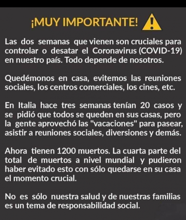 Primero que nada... Es un hecho que sea como sea de donde haya provenido el virus las medidas de cuidado son bases clave para evitar contagios y propagación, a quienes les debe importar de donde salio el virus es a los especialistas que ya estan trabajando en vacunas, las especulaciónes son las que siembran tanto caos y por lo tanto solo hacen brotar la estupidez de la gente, como ese saqueo por papel higiénico y demas... Por que no es como que limpiarte bien el culo te haga inmune... El problema de las vacaciones es la gente que no puede razonar mas alla, por que si piensan que todo seguira bien o que hay algo mas o que es falso o alguna tonteria ideológica mas sacada de la ciencia ficcion no hacen mas que bajar la guardia a lo que bien se ha dicho que es PANDEMIA, no es como que México, china y EUA se hayan puesto de acuerdo para joder a su gente... Es estúpido si quiera pensarlo, por que de una u de otra forma afecta a su económica (cosa que ya esta pasando a nivel general) Tambien esa palabra de pandemia... no es como que el apocalipsis y por eso la gente tiende a alarmarse... Ya que si tambien es cierto que el virus puede ser controlado a gente promedio (excepto niños, adultos mayores o gente con problemas inmunes) si han sido mas los casos que se curan pero hay que acatar como ley las medidas de HIGIENE Seguir saliendo a fiestas, vacacionar por que tipica frase mexicana *no pasa nada*.. Es gracias a un nivel de ignorancia y de iresponsabilidad, depende de cada uno pasar el dato de responsabilidad a sus seres queridos y conocidos, en especial a esos estupidines que dicen que les vale, arriesgandose y arriesgando a los demas, por que es como un resfrio pero que ataca a los pulmones tipo pulmonia o neumonia... Y creame... Yo ya he pasado por algo asi por experiencias con mi enfermedad y no les deseo a nadie ese tipo de sintomas... La difetencia con este virus... Es que aun no tiene una cura certera y puede ser mortal.... Cuidense... Y cuiden a sus familia... Eso no esta demas sea lo que sea el virus, si fue arma, si fue por que los chinos se puede Llegar a comer su excremento o lo que cojones haya sido... Eso no importa ya... Por que lo que debe importar es todo en referencia a como cuidarse uno mismo y a tus seres cercanos... No seguir a la polémica y desabasto por agua, alcohol y papel... Hay que tener prudencia y tantita madre... Les dejo 2 imagnes una de cuidados y otra para que vean lo que genera el alarmismo y la desinformación, compartalans y cuidenseAtlantes Edit: ANEXO DE INFORMACION para México ? https://www.gob.mx/salud/documentos/nuevo-coronavirus https://www.gob.mx/salud/documentos/covid-19-mitos-y-realidades?state=published