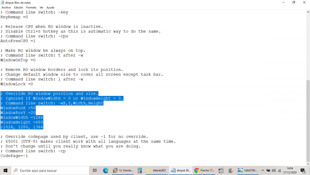 A MI NO ME FUNCIONA EL SETUP.EXE DEL SISTEMA DEL RO, ASÍ QUE YO LO SOLUCIONO ASÍ. modifica este archivo: Con algo como ésto: te dejo el texto para que lo copies. ; Override RO window position and size. ; Ignored if WindowWidth = 0 or WindowHeight = 0. ; Command line switch: -wX,Y,Width,Height WindowPosX =50 WindowPosY =20 WindowWidth =1266 WindowHeight =680 ;1024, 1280, 1366