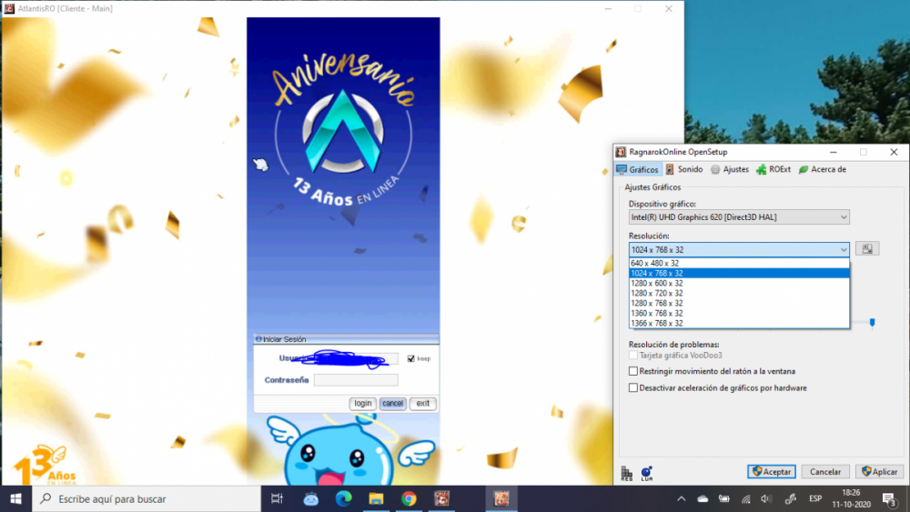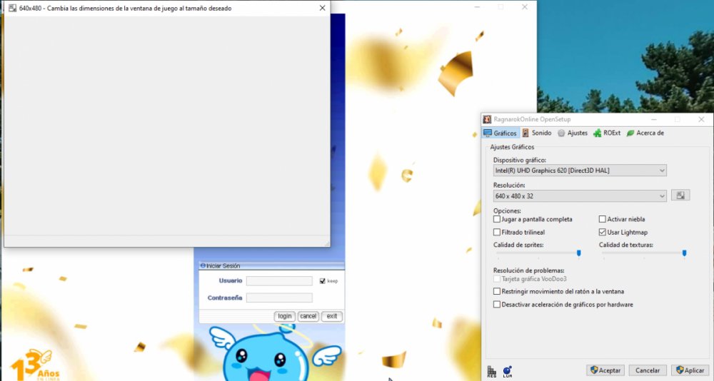 7. Buenas comunidad, necesito ayuda para poder configurar la pantalla del juego, resulta que abro mulicuentas exactamente 4, una en cada esquina de mi pantalla, no de la mas pequeña. Y cuando abrí el server de pruebas quedo con esa resolución y no logro cambiarla, queda la pantalla hasta abajo, que antes no pasaba, quedaba mas arriba y me era mas fácil cambiar entre cuentas, alguien me puede ayudar, adjunto imágenes. Muchas Gracias. Nota: El ragnarok Setup (Screen Size) no me muestra resoluciones ? Solo el opensetup.Aquí llega hasta abajo la pantalla.y aqui es muy pequeña. No deja poner Screen Size