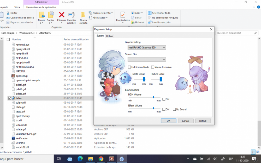 6. Ahora puedo ocupar el Ragnarok setup, pero no me da la opción que busco, la resolución que muestra la parte inferior es la de la primera Imagen, esta que puse es la 1024x768x16 y en la parte inferior se puede notar que hay espacio, pero es muy alargado de izquierda a derecha ?, tendré que descargar el juego denuevo? puede ser eso? Creo que la resolución es 1024x600x16 la que usaba. Muchas Gracias por las respuestas ?