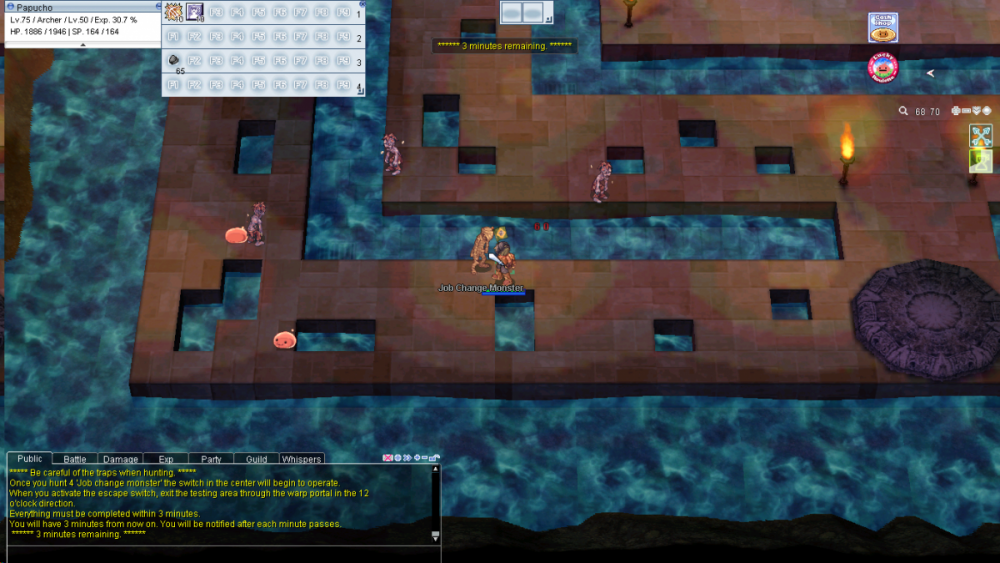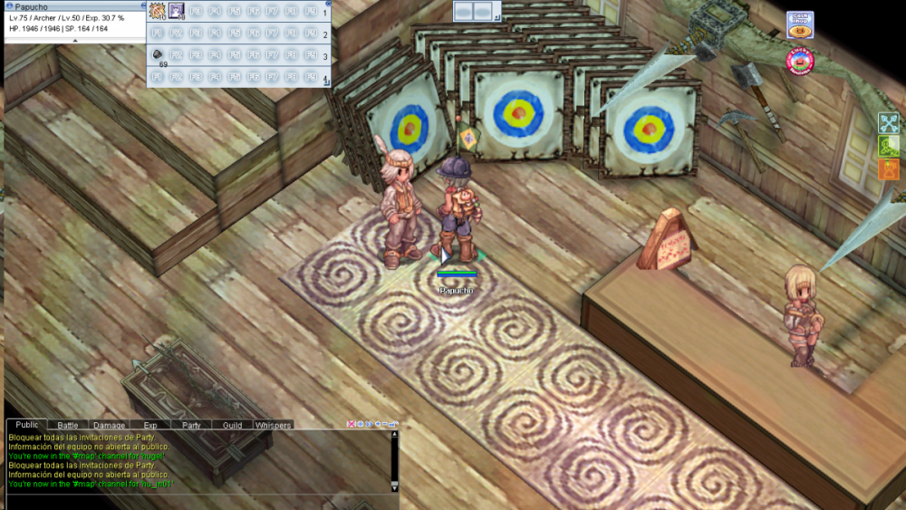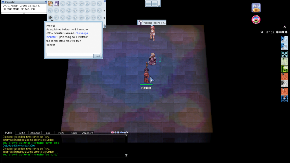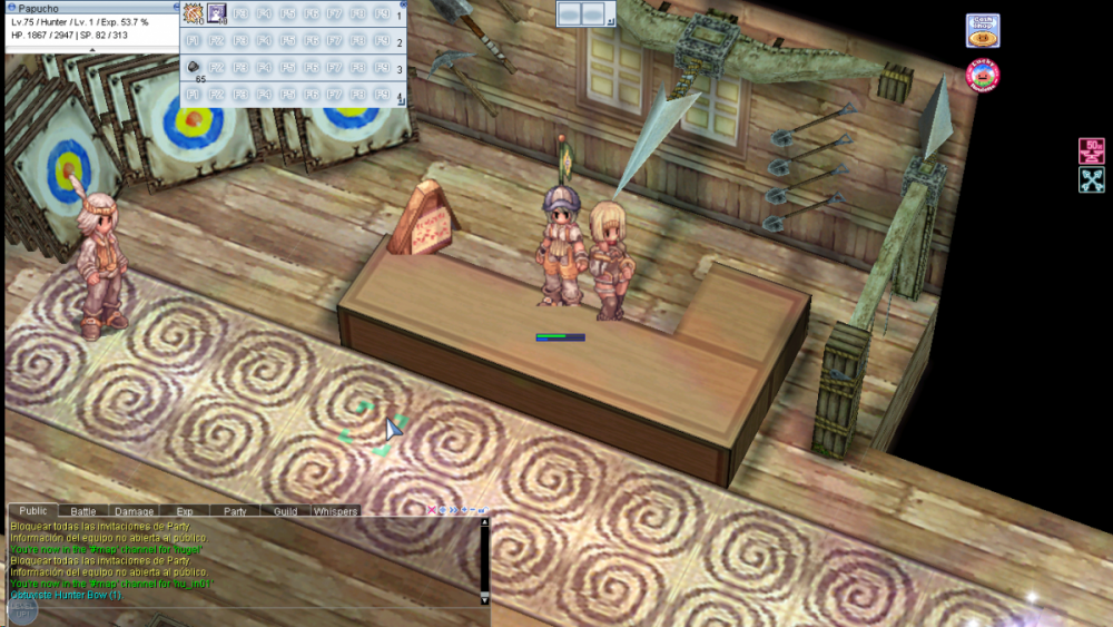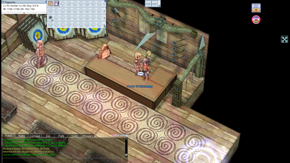 19. Requisitos: Ser archer class con al menos 40 nivel de job (se recomienda ser 50). Tener asignados todos tus puntos de skill hasta el momento. 1. Nos dirigimos a Hugel (208, 225), y entramos al cuartel general de Hunters. 2. Al entrar al edificio, hablaremos con Hunter Guildsman. y deberemos responder una serie de preguntas fáciles. Enseguida les dejaré las respuestas. Wander around alone and search for a place. Walk with a friend. Hunt at a nearby field. Go back to town. Would it be possible to get a heal, please? Open a chat room and wait. Tell the person about a good place to hunt. Guide them to their destination. Watch, then attack when asked for help. Try to find the owner. 3. Ahora hablaremos con Guild Receptionist, y él nos pedirá unos ítems al azar, un poco fáciles de conseguir. Estas son las listas de los ítems que nos podrán asignar: Set 1 5 Wolf Claw 5 Trunk 3 White Herb Set 2 9 Insect Peeling 9 Shell 9 Yellow Herb Set 3 3 Dokebi Horn 3 Piece of Egg Shell 10 Fluff Set 4 3 Venom Canine 5 Red Herb 3 Animal Skin Set 5 3 Bird's Bill 5 Skeleton Bone 3 Green Herb Set 6 3 Tooth of Bat 1 Sticky Mucus 1 Bear's Footskin Set 7 2 Porcupine Quill 1 Monkey Tail 1 Acorn 4. Ahora nos mandará a Payon, y de manera aleatoria nos dirá que debemos hablar con uno u otro NPC. Estos son los NPC a los cuales nos puede mandar con su respectiva localización. Esta se encuentra en donde nos convertimos en arquero. O bien, está este otro NPC, que se ubica en el centro de Payon, más no en el palacio. No hay que confundirnos. 5. Al hablar con cualquiera de estas 2 NPCs, nos dará unas cuantas flechas, y con ellas seremos transportados a una sala donde tendremos que realizar una labor muy similar a la de Assassin: Matar monstruos con el nombre "Job Change Monster" mientras esquivamos las trampas y superamos el tiempo. Cabe resaltar que si matas a un monstruo que no se llame así, deberás presentar la prueba nuevamente. Una vez matados a los monstruos necesarios llamados de esta manera, deberemos activar un switch que se encuentra en el centro, y finalmente llegar a la parte de arriba del mapa, donde se habrá abierto un portal con el switch activado. 6. Realizada la prueba y habiendo tomando el warp, nos regresaremos con la hunter que buscamos en Payon. Ella nos dirá que hemos superado con éxito su misión, y nos dirá que finalmente vayamos con la lider de los hunter, a Hugel. Al haber llegado con ella, simplemente le hablaremos y nos cambiará a Hunter, con su respectivo Hunter Bow de regalo.