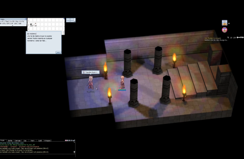 Hola a todos Don Viejito por acá nuevamente y hoy les comparto la guía de cambio de clase para la clase Warlock, enfocada para todos aquellos High Wizards que están preparados para dar el siguiente paso y convertirse en los magos mas poderosos y caóticos de todo Midgard, asique vamos con la guía: Para tener en consideración Debes ser High Wizard, es decir, haber renacido y llegar al nivel máximo 99 Base y 70 Job Tener consumibles de HP y SP ya que se utilizaran muchisimos Tener equipo básico o algo mas avanzado ya que la prueba es difícil sin este Tener la quest de acceso al New World ---------------------------------------------------------------------------------------------------------------------------------------------------------------------------------------------------------------------------- Para comenzar con la misión nos dirigiremos a la cuidad de Morocc y buscaremos al NPC Volunteer Moroc que se encuentra en la zona abajo a la izquierda del algo del centro de la cuidad, en la posición que indica la imagen. Le hablaremos y nos dirá que esta muy ocupado, esto nos habilitara una opción de dialogo especial que se activara una vez nos encontremos al pie de la palmera que se encuentra justamente a su derecha, en este dialogo daremos la opción de extender la mano y seremos teletransportados a una sala pequeña donde se encuentra la NPC Guildmaster quién nos evaluara para convertirnos en Warlocks. Una vez dentro de esta sala hablaremos con la NPC Guildmaster quien nos contara acerca de los Warlocks y nosotros diremos que deseamos convertirnos en uno. Luego de este dialogo debemos hablar con uno de sus asistentes, en este caso el que se encuentra a la izquierda de la pantalla, la de cabello rubio y ropas azules quien nos dará nuestra primera prueba. Prueba de recolección. Una vez que hablamos con el NPC Assistant nos entregara 2 ítems especiales que se equipan en los slot del accesorio, cada una con una función especifica, aumentan el daño sobre los monstruos Naga y Bradium Golem y dan la posibilidad de dropear un cristal especial de cada uno, este cristal es el que debemos recolectar para terminar la primera prueba. Esta prueba se realiza en el mapa Splendid Field 2, para llegar a este hablaremos con el hada que se encuentra atrás de la Guildmaster y nos teletransportara a la cuidad de Splendid y en este lugar iremos al warp de la derecha para llegar al mapa de la cacería. Es sumamente importante que estes con los accesorios equipados SIEMPRE en caso contrario nunca obtendrás los drops, te recomiendo el uso de la skill Water Ball ya que es lo mas sencillo para acbar con la mob de este mapa ya que toda esta es agresiva, por lo que te recomiendo andar con sumo cuidado y te armes de paciencia por que este proceso es muy pero muuuuuuuuuy lento. En caso de que mueras y no sabes como llegar al mapa debes tener la quest de New World realizada, te enseño como hacerla de manera rápida en el video que dejo adjunto de la guía versión grafica (véanlo comente algo lindo y espero les sirva). Una vez que te dropean los ítems necesarios iremos a la cuidad de Splendid a la casa de Yoop, te recomiendo usar el siguiente navi para llegar (/navi spl_in02 60/231) y aca nos desequiparemos los ítems para devolverlos a su dueño y entregaremos las piedras, saliendo de esta nos toca devolvernos donde la Guildmaster por lo que caminaremos hacia un punto especifico de la cuidad siguiendo el navi que comparto (/navi splendide 140/284) y aquí nos aparecerá el dialogo para entrar en la sala nuevamente. Intentaremos hablar con ella pero nos dirán que esta muy ocupada, por lo que debemos hablar con el hada de cabello azul, esta nos teletransportara a una sala donde comenzaremos con nuestra segunda y ultima prueba. Prueba de Magia. La ultima prueba es la mas difícil de todas debido a su naturaleza, por esto te recomiendo usar tu mejor equipo, tus mejores consumibles ya que tu vida bailara de full a nada en cosa de segundos, esta consiste en derrotar a 4 oleadas de mosntruos en una sala muy chica, estos monstruos son agresivos y de nivel muy alto, es aqui donde radica la dificultad de la mision, como ayuda adicional nos daran 4 piedras especiales que son considerados como items consumibles que nos darán acceso a skill de Warlock para hacer uso en esta prueba, estas son: Frost Misty Nivel 5 (Ataque en area de elemento agua). Crimson Rock Nivel 5 (Ataque en area de elemnto fuego). Chain lightning Nivel 5 (Ataque de elemento viento). Earth Strain Nivel 5 (Ataque en area de elemento tierra). Te recomiendo acomodarlos en tu barra de skills para acceder a ellos ya que nos ayudaran de mucho en las primeras 2 oleadas, y estas seran de la siguiente manera: Oleada 1: 2 Naga, 2 Bradium Golem, 2 Dark Pinguicula y 2 Aqua Elemental. Oleada 2: 2 Naga, 2 Bradium Golem, 2 Dark Pinguicula y 2 Aqua Elemental. Oleada 3: 8 Porings. Oleada 4: Un cristal de 250K de vida. Contaremos con 5 minutos para eliminar cada oleada excepto el cristal que tendrás 10 minutos, asique te recomiendo usar todas las skills que puedas y animo por que esta parte es mucho peor que la recolección de ítems, como recomendación al cristal dale con skills de fuego ya que les causan mayor daño según mis testeos. Finalmente terminada la prueba volveremos a la sala original y hablaremos con el Hada que nos teletransporto a la sala de pruebas y nos dira que la completamso exitosamente, luego hablaremos con la NPC Guildmaster quien nos convertirá finalmente en Warlock y nos regalara 2 items: Magic Stone Hat [1] y Green Apple Ring. Y con eso termina la guia, espero te sea de ayuda y cualquir duda puedes dejarla en los comentarios, les comparto ademas el video de la version grafica que puede ser de ayuda visual en caso de ser necesario, pasen a darle amor y cariño. Y finalmente les recuerdo que la guild Elderson esta reclutando gente sin restricción, solo con ganas de participar (mas horario fin de semana ya que la semana se tra