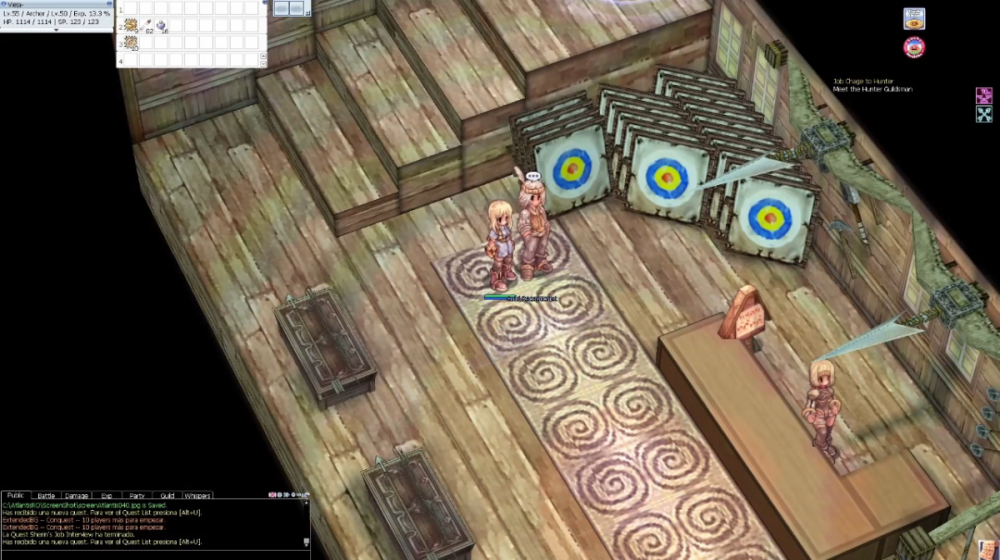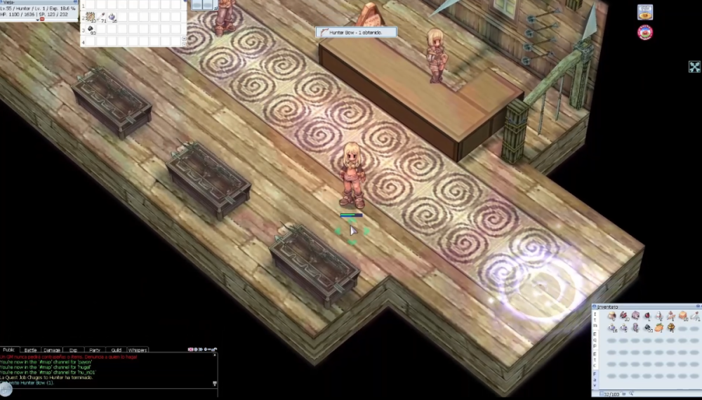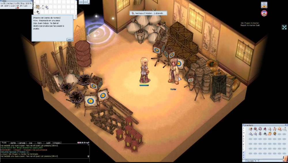 Hola a todos estimados pixeleros del mundo de Midgard, Don Viejito por acá nuevamente y hoy les compartiré la guía de cambio de clase para convertirnos en Hunters, una clase sumamente amigable para los nuevos jugadores, con una buena versatilidad y sobre todo muy entretenida, asique si te interesa este JOB lee esta publicación que te será de muchísima utilidad. Para tener en consideración. Debes ser mínimo JOB 40 para iniciar la misión, pero se recomienda presentarse nivel JOB 50. Ten a mano consumibles de HP y SP. ----------------------------------------------------------------------------------------------------------------------------------------------------------------------------------------------------------------------------------------------------------------- Para comenzar con la misión nos debemos dirigir a la ciudad de Hugel en la cual se encuentra la guild de Hunters y donde podremos comenzar nuestras misiones, este edificio se encuentra en la parte superior izquierda del mapa, justo por arriba del zepeling de esta misma ciudad. Dentro del edificio debemos hablar con la NPC Hunter Guildsman, quien se encontrara tras el mesón nada mas acceder al edificio, ella nos hablara sobre que se debe hacer para convertirse en Hunter, indicándonos que debemos superar 3 distintas pruebas antes de lograrlo. Luego de decirle que estamos preparados ella nos evaluara la primera misión siendo esta una prueba de resolución de preguntas. Prueba Teórica. Esta prueba consiste en responder preguntas, un total de 10 según una historia que nos cuenta la NPC donde nos sitúa en varios escenarios donde debemos actuar como un verdadero Hunter, debemos tener un total mínimo de 8 buenas para aprobar la prueba, por lo que te comparto las respuestas (consideren que el texto mostrado corresponde al ultimo dialogo antes de las alternativas): Eres un Archer y no sabes a donde deberías ir a cazar, ¿Qué haces?, respuesta: Andar solo y buscar un lugar. Pero estas en Payon, ¿Cómo vas al desierto?, respuesta: Caminar con un amigo. ¿Cómo vas a hacer el zeny que necesitas?, respuesta: Cazar en un campo cercano. ¿Cuál es tu solución a esta situación?, respuesta: Regresar al pueblo. Digamos que estas teniendo muchos problemas cazando Hodes y regresaste al pueblo, ahora estas sin hp y de casualidad un Priest se encuentra ahí como pedirías un Heal, respuesta: seria posible me des un Heal porfavor. ¿Cuál es la mejor manera para vender tu objeto?, respuesta: Abrir una sala de chat y esperar. Mientras esperas alguien esta rogando por objetos y zeny, ¿Qué deberías hacer?, respuesta: Decirle a la persona un buen lugar para cazar. Pero en tu camino encuentras a alguien que esta perdido, ¿Qué deberías hacer?, respuesta: Guiarlo a su destino. ¿Qué deberías hacer?, respuesta: Observar, después atacar cuando se me pida ayuda. ¡Pero que es esto! Encuentras un objeto costoso tirado en el suelo, ¿Qué deberías hacer con el?, respuesta: Intentar encontrar al dueño. Una vez terminada la prueba y aprobado esta misma nos enviara a buscar al NPC Guild Recepcionist quien nos indicara nuestra segunda prueba, este NPC se encuentra al lado izquierdo de la habitación. Prueba de recolección. La segunda prueba consiste en traer una serie de objetos que nos pedirá el NPC, hay un total de 7 set distintos y nos tocara uno completamente al azar, los set disponibles son los siguientes: Set 1 Bill of Birds x3, dropeado por peco peco. Skel-Bone x5, dropeado por skeleton. Green Herb x3, dropeado por green plant. Set 2 Venom Canine x3, dropeado por snake. Animal Skin x3, dropeado por wolf. Red Herb x5, dropeado por red plant. Set 3 Dokebi Horn x3, dropeado por dokebi. Piece Of egg shell x3, dropeado por eggyra. Fluff x10, dropeado por fabre. Set 4 Yellow Herb x9, dropeado por yellow plant. Worm Peeling x9, dropeado por thief bug. Shell x9, dropeado por chonchon. Set 5 Thooth of Bat x3, dropeado por familiar. Sticky Mucus x1, dropeado por orc zombie. Bear's Footskin x1, dropeado por bigfoot. Set 6 Yoyo Tail x1, dropeado por peco yoyo. Porcupine Quill x2, dropeado por caramel. Acorn x1, dropeado por coco. Set 7 White Herb x3, dropeado por white plant. Trunk x5, dropeado por elder willow. Claw of Desert Wolf x5, dropeado por desert wolf. Una vez que regresemos con los ítems el NPC nos felicitara y nos enviara a buscar al Guildsman quien se encuentra en 2 posibles ubicaciones. La primera es en la guild de Archers en una de las salas laterales y la otra es en e castillo de Payon, ahora te muestro esta ubicación. Iremos a la ciudad de Payon y caminamos hacia el centro del mapa donde esta el catillo y entraremos en el portal de la derecha. Entraremos en el portal y luego en el primero que veamos, este nos enviara a una sala donde encontraremos al NPC Guildsman quien será el encargado de tomar nuestra tercer y ultima prueba para poder convertirnos en Hunters. Prueba Practica. Nuestra ultima prueba consiste en una cacería de monstruos especiales, en esta debemos hablar con el NPC quien nos enviara a una salsa donde aparecerán monstruos de tipo undead, nuestra misión consiste en exterminar un mínimo de 4 monstruos con el nombre de "Job Change Monster" tal como aparece escrito aquí, con mayúsculas y espacios, en el mapa debes evitar caminar por los sitios con agua ya que son trampas y contaras con 5 minutos para esta prueba en su totalidad. Si nos equivocamos eliminando monstruos, caemos en las trampas de agua o fuera del mapa o no logramos terminarla en el tiempo establecido, seremos expulsados de la sala y deberemos comenzar con la misión nuevamente. Una vez que elimines a los 4 mobs, te saldrá un anuncio de que en el centro del mapa aparecerá un botón para activar el portal de salida, cuidado con caerte en las trampas, una vez activado el botón podemos dirigirnos al portal que nos enviara con el NPC Guildmaster quien nos felicitara por completar la prueba y nos entregara un necklace of wisdom, este ob
