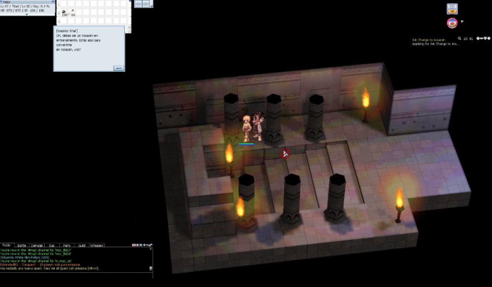 Wena a todos los cabros, como están!!??, Don Viejito por acá nuevamente y hoy les vengo a compartir una nueva guía de cambio de clase, en esta ocasión nos enfocaremos en los Assassin una de las clases mas populares del juego por su versatilidad y capacidad de soleo (ropa bonita, nada mas jajajaja),asique si ya tienes tu Thief y estas decidido a convertirte en un lobo solitario esta es tu guía 😉. PD: Antes de comenzar quiero disculparme ya que en esta guía se me olvido sacar screenshots de casi todos, por no decir todos los npc, asique sacare imágenes del video que recomiendo ver en caso de necesitar mejor referencia visual. Para tener en consideración. Debes tener nivel de JOB 40 o mas para poder comenzar la quest, se recomienda altamente presentarse con nivel JOB 50. Tener o contar con consumibles de HP y alas de mosca a mano. ----------------------------------------------------------------------------------------------------------------------------------------------------------------------------------------------------------------------------------------------- Para comenzar con la misión debemos dirigirnos a la cuidad de Morroc, ya que de este sitio emprenderemos un viaje hasta el escondite de los Assassin que se encuentra en medio del desierto, específicamente dos mapas abajo y dos a la derecha de la cuidad, por lo que ten a mano tus alitas de mosca. Una vez llegado al mapa donde se encuentra la guarida, debemos dirigirnos a la entrada de manera rápida ya que esta lleno de mob hostil que nos estará acosando constantemente, por lo que recomiendo entrar apenas podamos para estar mas seguro. Dentro del edificio nos dirigiremos al final del pasillo para hablar con el NPC Guildsman, a quien le indicaremos que deseamos ser Asesinos y podremos comenzar con las pruebas. Nos enviara a una nueva sala donde encontraremos al NPC Assassin Kai, que se encontrara en un costado de la habitación encima de las escaleras, para hablarle debemos acercarnos ya que se considera sensible y no le gusta que le griten, por lo que una vez entablamos conversación nos teletransportara a una sala donde podremos comenzar con las pruebas para convertirnos en Assassins. En esta nueva habitación nos encontraremos con la NPC Test Guide, quién será la encargada de tomarnos nuestra primera y segunda prueba para convertirnos en Assassins, por lo que procederemos a hablarle para comenzar. Cuando le hablemos y termine su dialogo comenzara nuestra primera mision. Prueba teórica. Esta prueba consiste en responder un total de 10 preguntas a las que mínimo debemos acertar 8 de estas para superar la prueba, existen 3 distintos set de preguntas que pueden ser consideradas, las respuestas son: SET 1: ¿Qué monstruo deja caer un Katar ranurado?, respuesta: Desert Wolf. ¿Qué tarjeta que se enumera a continuación se puede insertar en un Jur?, respuesta: Caramel. ¿Qué clase puede forjar armas?, respuesta: Blacksmith. ¿Qué arma de la siguiente lista no es un arma de clase Katar?, respuesta: Gladius. ¿En Bybalan Dungeon una gran cantidad de monstruos son de qué tipo elemental?, respuesta: Agua. ¿Qué monstruo enumerado a continuación no se puede domesticar y convertir en una linda mascota?, respuesta: Roda Frog. Elige el monstruo que sea más débil para disparar, respuesta: Kobold (axe). Elige el Katar no elemental, respuesta: Infiltrator. Elige el monstruo que no pertenece al grupo, respuesta: Creamy. Elige un monstruo que no sea un muerto viviente, respuesta: Poison Spore. SET 2: Elige la habilidad que no es requerida para aprender Grimtooth, respuesta: Righ Hand Mastery nivel 2. Que propiedad posee Enchant Poison, respuesta: Veneno. Como funciona el nivel 4 de Righ Hand Mastery, respuesta: Recobra el 90% del daño. Cual es el objeto requerido para usar Venom Dust, respuesta: Red Gemstone. Cual es la habilidad que puedes aprender cuando alcanzas el nivel 5 de Enchat Poison, respuesta: Venom Dust. De las siguientes habilidades, cual te permite caminar mientas estas invisible, respuesta: Cloaking. Elije la condición que no tiene relación a Venom Splasher, respuesta: Red Gemstone. Cual monstruo es débil a un arma con vadon card (añade 20% de daño hacia monstruos de propiedad fuego), respuesta: Elder willow. Cuanto sp necesita double attack, respuesta: Es una pasiva por lo que su uso de sp es nulo. Cual es la mejor Main Gauche elemental para cazan en la dungeon de Izlude, respuesta: Main Gauche de viento. SET 3: ¿Cuál es el aumento de la tasa de esquiva que obtienes cuando tienes la habilidad "Mejorar esquiva" en el nivel 10?, respuesta: 30. ¿Qué monstruo puede detectar a alguien que está oculto/encubierto?, respuesta: Whispers. Los asesinos pueden usar armas duales. ¿Qué conjunto de armas puede usar un Asesino?, resppuesta: Damascus y Stiletto. ¿En qué ciudad te conviertes en ladrón?, respuesta: Morroc. ¿Qué carta no tiene nada que ver con la agilidad?, respuesta: Whisper Card. ¿Qué hace que Assassins sea tan especial?, respuesta: Excelente capacidad de esquiva. Cuando un Asesino alcanza un nivel de Trabajo de 50, ¿cuál es la bonificación adicional que recibe en agilidad?, respuesta: 10. ¿Qué equipo no puede utilizar un Asesino?, respuesta: Golden Helm. Cuando un novato quiere convertirse en ladrón, ¿qué hongos necesita robar?, respuesta: Orange Net Mushrooms o Orange Gooey Mushrooms. ¿Qué carta enumerada a continuación es inútil para un Asesino?, respuesta: Elder Willow Card. Una vez que completemos con éxito la prueba deberemos hablar nuevamente con la NPC Test Guide para comenzar con la segunda prueba para convertirnos en Assassins. Prueba practica especial. La segunda prueba consiste en una prueba practica donde debemos eliminar mobs con un nombre especial dentro de un periodo de tiempo, para ello nos indican las siguientes instrucciones que debes tener en consideración para completar la prueba de manera correcta: Cazaremos los mobs con el nombre especifico de Job Ch