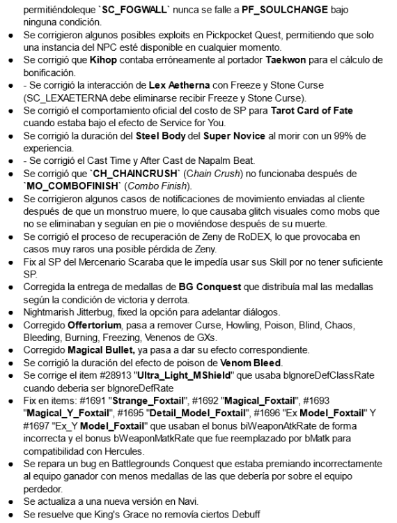 Queridos Aventureros Habrá una desconexión para mantenimiento general y subir unas actualizaciones al emulador para su versión más reciente de Hercules con la finalidad de resolver varias inconsistencias que se estaban suscitando desde el Update importante de hace 1 mes. A continuación detallaremos los cambios que que te importan que son los enfocados a gameplay pero a su vez hay varios cambios a nivel estructural que no están relacionados al gameplay sino al funcionamiento propio del emulador, el server y su estabilidad. Changelog Relevante [Cambios Emulador] [Cambios en NPCs] Se corrige el problema de que los Doram no podían usar storage en varios NPCs: [Cambios en Items] Se corrige un error al el item ID #610 "Leaf_Of_Yggdrasil" en personajes que tuviesen la skill Resurrection, donde les pedia de catalizador "Blue Gemstone". [Cambios en Skills] Se corrige un problema con las skills #2008 "RK_DRAGONBREATH" Y #5004 "RK_DRAGONBREATH_WATER" que estaban ignorando skills que dan inmunidad a daño rango (como pneuma o Neutral Barrier). Se mejora la emulación del procesamiento de los Hits de Catnip Meteor, realizaba más hits de los que deberia. [Cambios Varios] Se aumenta el nivel máximo de los Expanded Super Novice de 160/50 a 175/60 (ya habia sido aplicado en el update anterior, pero tenian bonus de HP y SP incorrectos). Se corrige el item #31189 "C_Cat_Ears_Cape_Red" que no se visualizaba al equiparse. Se corrige el combo entre los items #13027 "Scalpel" y #15044 "Green_Operation_Coat", el bonus tomaba el refine del arma, cuando debia ser el de la armadura. Se deshabilita la opción de hacer warp a castillos de WoE por medio de la interfaz de guild, la misma tenia errores no está totalmente depurada. Se agrega a la tienda el #200020 Costama Halloween IV <- (Da click para ver la colección) Sale de la tienda el Costama #10529 June Bride II. Se realiza la rotación de castillos de WOE 1.0, 2.0 y Balanceada, pasando de Prontera a Aldebaran y de Yuno a Rachel Nuevos (Rotación): WoE FE primera hora: Aldebaran (Castillo aldeg_cas02) WoE FE segunda hora: Aldebaran (Castillo aldeg_cas03) WoE Balanceada: Aldebaran (Castillo aldeg_cas05) WoE SE primera hora: Rachel Arunafeltz (Castillo arug_cas04) WoE SE segunda hora: Rachel Arunafeltz (Castillo arug_cas03) Anteriores: WoE FE primera hora: Prontera (Castillo prtg_cas01) WoE FE segunda hora: Prontera (Castillo prtg_cas02) WoE Balanceada: Prontera (Castillo prtg_cas04) WoE SE primera hora: Yuno Schwaltzvalt (Castillo schg_cas02) WoE SE segunda hora: Yuno Schwaltzvalt (Castillo schg_cas01) NOTA: La rotación de WoE se aplaza para la siguiente desconexión. Cualquier comentario o sugerencia por favor postéenla. La desconexión tendrá una duración de unos 30 minutos. Mientras, si gustas, aprovecha para Votar por el servidor. ¡Vota en RagnaTop! ¡Vota en Top Hispano!